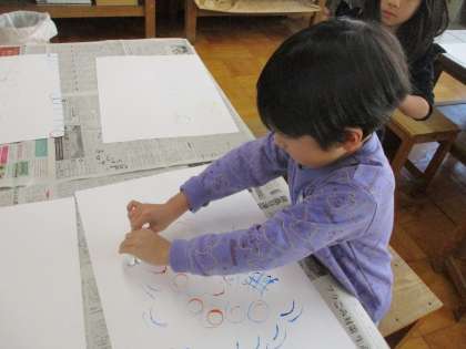 1年生の図画工作科では、「うつしたかたちから」という学習が始まりました。今日は、材料を紙にうつして、どんな形ができるか考えました。たくさんうつした紙をながめて、「花畑に見えてきた」「観覧車みたい」といった発見をしていました。