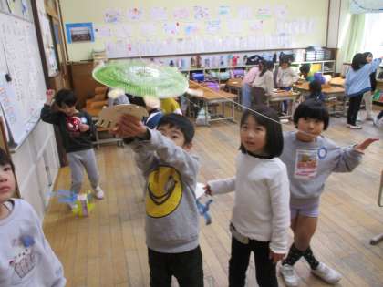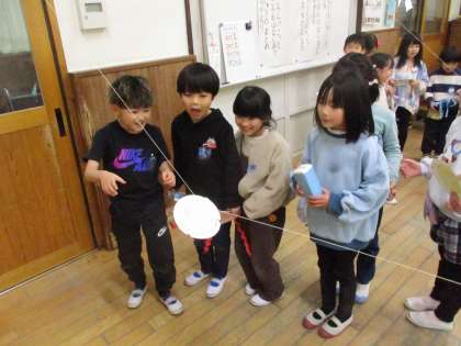 1年生の図画工作科では、「スルスルビューン」の学習をしました。今日は、出来上がった作品を滑らせて楽しみました。「ひらひらしているところがかわいいね。」「滑らないようなものを滑らせるのが面白いな。」といった気づきが出ており、子どもたちは友達の作品のいいところを見つけながら、楽しんでいました。