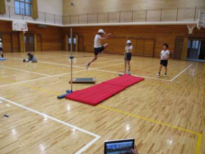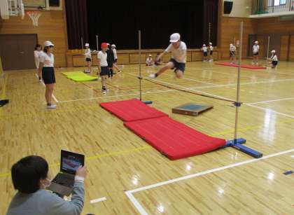 6年生の体育科では「走り高跳び」の学習をしています。今日は、GIGA端末を使って撮影しながら、記録を更新するためにはどうすればよいかを考えて、取り組むことができました。