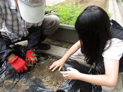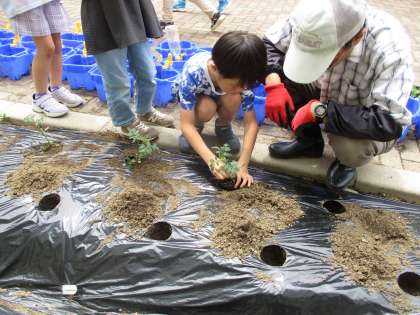 生活科の学習では「おいしいやさいをそだてたい」の単元に入っています。今日は、さっそく地域の方に協力してもらい、ミニトマトのなえを植えました。子どもたちは、「おいしくそだってほしいな」や「おうちの人に食べてほしいな」などの思いをもって楽しく植えている様子でした。