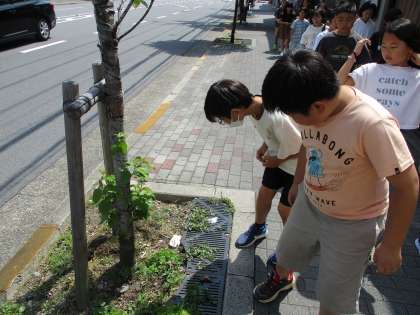 総合はばたき「見つけよう!伝えよう!西大路のすばらしさ」では、「西大路は、環境にやさしいまちなのかを考えよう」という課題のもと、実際に校区に出かけてまちの環境の調査に行きました。ポイ捨てがたくさんされていたり、校門付近の溝にもたくさんのごみが捨てられていることに気付いたりしました。次は、御所ノ内公園方面にも調査に行きます。