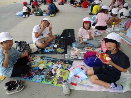 京都水族館の後は、梅小路公園へ移動してお弁当を食べました。子どもたちは、外でみんなで食べるお弁当にとても喜んでいました。お弁当の後は、広い広場でおにごっこをしたりして汗びっしょりで遊んでいました。