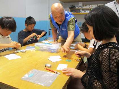 今日は、モノづくりの殿堂・工房学習がありました。まずは、工房学習からスタートです。堀場製作所で働いている方から温度計の作り方を教えて頂きました。作り方をよく聞きながら集中をして作業に取り組み、モノレンジャーさんにも助けてもらいながら満足のいく作品を作っていました。その後、コールドスプレーやドライヤーをセンサーに当てて温度をはかり、自分が作ったモノのすごさに驚いていました。