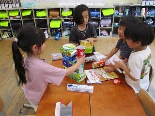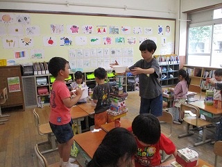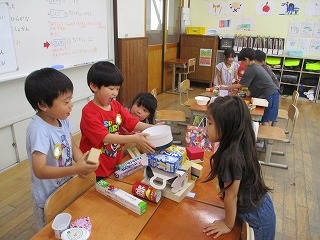 今日の算数は、持ってきた箱を組み合わせて、