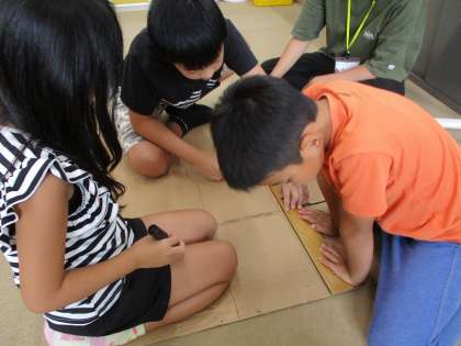 かねおの大きさを考えて、お家はどのくらい大きくしないといけないかな?と6年生を中心にして考え、段ボールを切ってお家の外枠を作っています。
