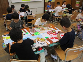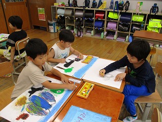 お話の内容や、お話に登場した生き物を思い出し、描きたい場面を考えて描くことができました。「友達の色って何色かな?」と聞くと、「ピンク色」「虹色」など、色々な意見があがりました。自分の考えた色を使って楽しんで絵を描く子ども達でした。