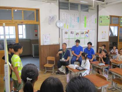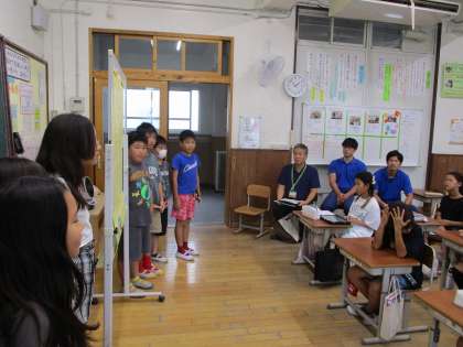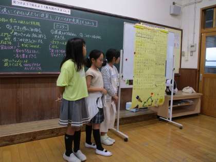 総合はばたきの学習では、自分たちが考えた提案を環境に詳しい人々に聞いてもらいました。それぞれのグループに対して、様々なアドバイスをしてもらい、子どもたちも自分たちの提案に自信をもったり、よりよくしようとする思いを高めたりしていました。