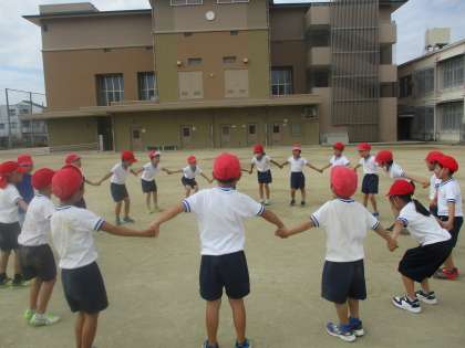 「くじらぐも」のお話が大好きな子ども達。体育で外に出ている時に、「くじらぐもみたいな雲がある!」と教えてくれた友達がいました。そこで、お話を思い出してみんなで手をつないで輪になり、「天までとどけ、一、二、三。」とジャンプしました。雲のくじらに乗ることはできませんでしたが、みんなで何度もチャレンジして楽しむ子ども達でした。