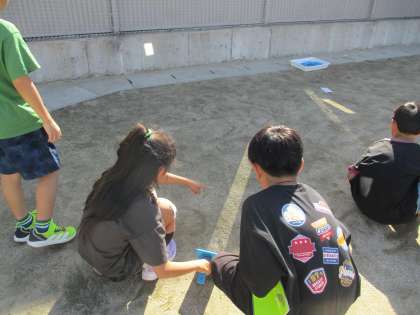 今日は天気が良かったので、外で鏡を使った実験を行うことができました。