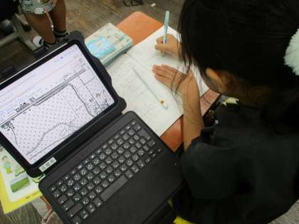 昔の学校の周りが田畑ばかりで驚いた様子の子どもたち。
