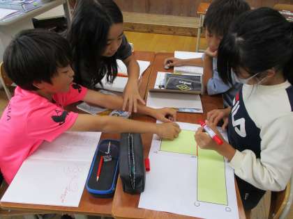 算数科「面積」の学習では、L字型の面積を工夫して求めました。図形に線を入れて正方形と長方形に分けて考えたり、つなぎ足して考えたりしたことを話し合いました。全体交流の中では、友達の意見を聞いて、工夫して求める方法がいくつもあることに気付きました。