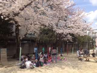 学校の桜は満開です。学童保育所ホットクラブの子どもたちがお花見ランチをしていました。