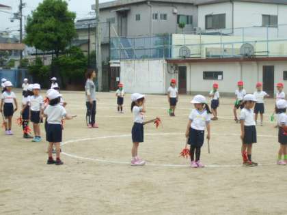 演技の動きは覚えました。次に運動場に出て場所や移動の動きをなどを覚えています。