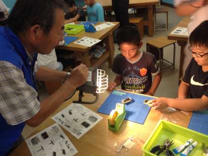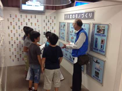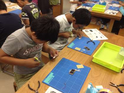 京都には,伝統文化・工芸から発展してきた現在の先端技術をもつものづくり企業がたくさんあります。「モノづくり」企業がどんなモノを作っているのかを展示ブースを回って調べました。その後,地下工房で,ソーラーパネルを使った模型の工作をしました。