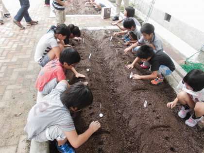 4年生がこれから育てていくのは,かぶらです。お話が終わってから,種まきをしました。
