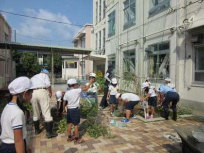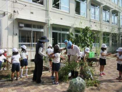今日,地域の先生に教えていただきながら,トマト畑のお片づけをしました。大きく育ち,たくさん実をつけたトマト畑とも今日でお別れです。子どもたちは「ありがとう。」と言いながら,汗をかきかきトマト畑を片づけていきました。