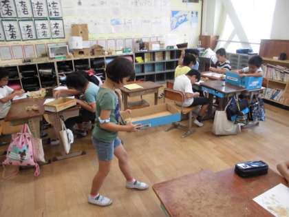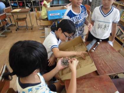 箱の中にネギ坊主を入れて,前後にゆすると,種だけが集まってくることを発見しました。