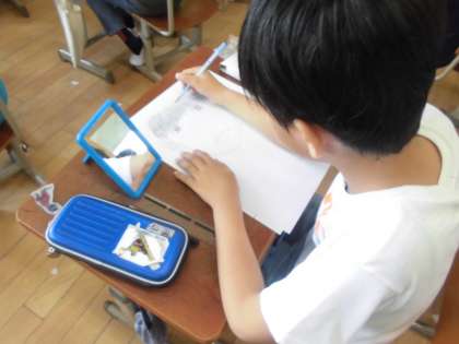 5年生になった自分の姿を描くことを目標に自画像を描き始めました。鏡で自分の顔を見ながら,大きくはみ出すことや表情,雰囲気を出すことを大切に,下描きを進めました。