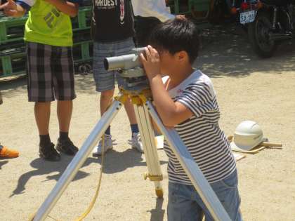 教室で見学できると知ると「やった〜!」と大喜びの子どもたち。いざ外へ出てみてみると,深く掘られてすっかり姿が変わっている運動場にびっくりしたようでした。公益財団法人京都市埋蔵文化財研究所の方から,発掘の仕方や道具を教えてもらいました。そして,測量の機器から計測する体験もさせていただきました。地面から出てきた平安時代の水路であろうと予想される水路跡,木製の史跡を見せてもらいました。