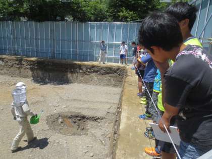 学校では,体育館を新設するための工事を行います。それに先立って,運動場で埋蔵文化財発掘調査をしています。
