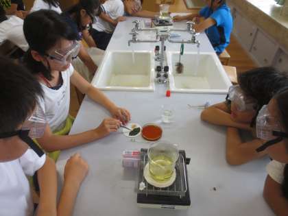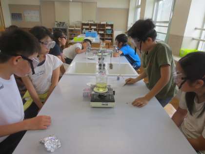 子どもたちが予想しました。今日は,葉に日光を当てて,でんぷんができるかどうか調べます。昨日,ジャガイモの葉にアルミを巻きました。今日が晴れるといいなあと思っていましたが,ちゃんと晴れてくれたので,無事,調べることができました。そして,反応があり,日光ででんぷんができることを確かめられました。梅雨の晴れ間,ありがたかったです。