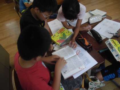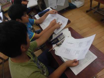 8日(木)の学習では,この日までに作った漢字暗号文を数点担任が選び,「友達からの挑戦」として友達の作った暗号文を解きました。なかなかの難問もあり,一人の力ではなかなか答えを導き出すことができません。ペアで話し合っても答えが分からない問題もあり,最後にはグループで話しました。中には「こんな言葉あるのかな」と辞書を使って調べている様子も見られました。授業の最後には,問題を作った出題者から答えの出し方の説明があり,全員がすっきりした気持ちで授業を終えました。