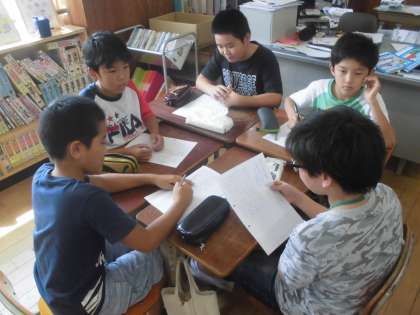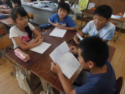 そこで話し合いの形は少し変えました。主に生活班で行っていますが,まず同じ作文を選んだ同士で,次に生活班で,話し合いと意見交流を行いました。