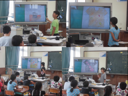 外国語活動「デザイナーになろう」では,前回作ったオリジナルのTシャツを互いに紹介し合いました。教室を回り,ペアを見つけて,自分の作ったTシャツを友だちに紹介して学習のまとめをしました。最後には,誰のTシャツなのかを当てるクイズをして,どんなTシャツなのかを紹介することで英語の表現に慣れ親しめるようにしました。多くの子どもたちがクラスのほとんどの友だちとやり取りをすることができ,めあてに向かって一生懸命学習に取り組むことができました。自分の作ったTシャツを少しでも知ってもらおうと学習した英語表現が飛び交う一時間となりました。