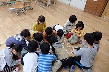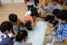 写真は,くじらぐもの作成中です。白い画用紙をちぎってちぎって,もくもく感を出します。糊係とちぎる係を分担して,ペタペタと作業を進めます。みんなで輪っかになって全員で掲示作りに取り組みました。