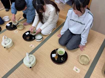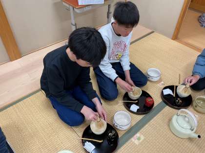 5・6時間目に、茶道体験を行いました。今回は、実際に自分でお茶を点てて頂きました。自分で量を調節し、苦みも味わいながら頂くことができました。これからも日本の伝統文化に触れながら、よさについて考えを深めていければと思います。