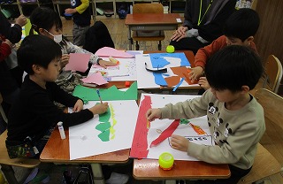 色画用紙をやぶいてできた色々な形から想像を膨らませて描きました。やぶいた画用紙の形を見て、「ぞうに見える。」「サメに見える。」など発言しながら、友だちと楽しんで製作することができました。