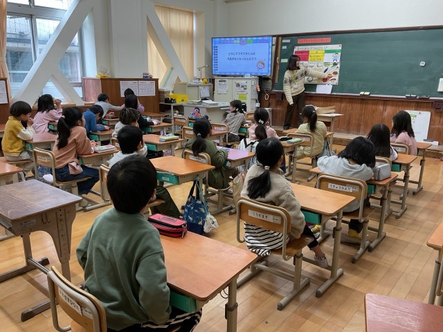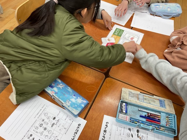 栄養教諭に食に関する授業をしてもらいました。この食材がどのはたらきがあるのかをグループで協力して考えてました。