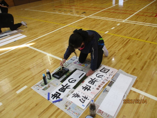 いつもの半紙とちがい、長い画仙紙で書きました。