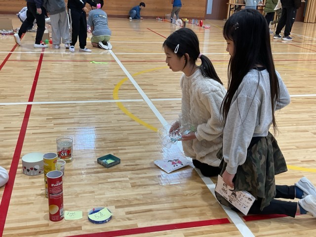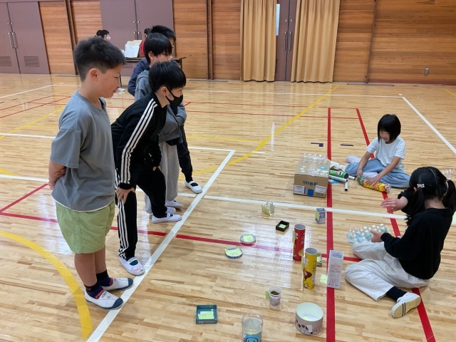 2年生が工夫を凝らして作ったおもちゃ、3年生も大喜びで遊んでいました。