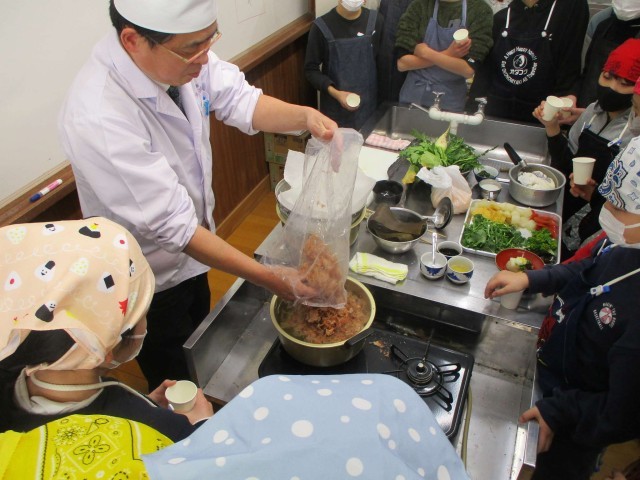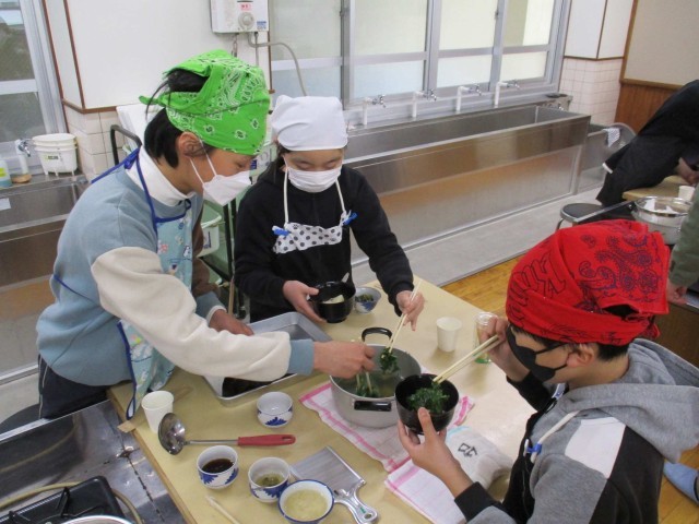 6年生の国語科では、「発見、日本文化のみりょく」の学習をしています。今回は、和食のよさやみりょくについて知るために、料亭の方をゲストティーチャーとしてお招きし、和食づくりを体験しました。だしの試飲をしたり、だしを作ったりした後、冬の野菜のたきあわせを作りました。自分たちが育てた野菜も具材として使われ、色や香りを確かめながら作ることができました。最後には、ゲストティーチャーの方に質問をして、和食についてより深めることができました。