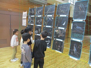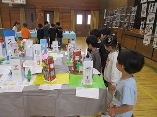 一年生にとっては初めての作品展。体育館にずらりと並んだ全ての学年の作品を、胸を躍らせて鑑賞しました。「先生、見て。この作品すごいよ。」「私たちも大きくなったらこんな作品を作れるのかな。」と、上級生の作品を見てわくわくしている様子でした。