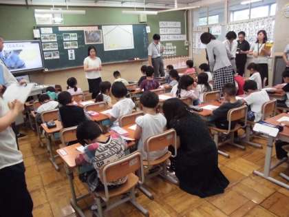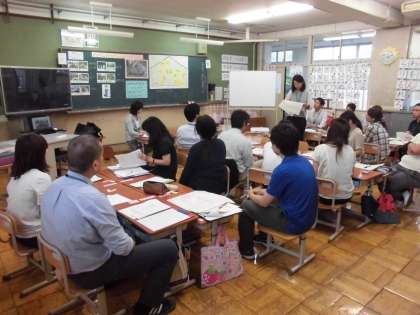 1年3組で研究授業を行い,教職員が授業を通して学びを深めました。