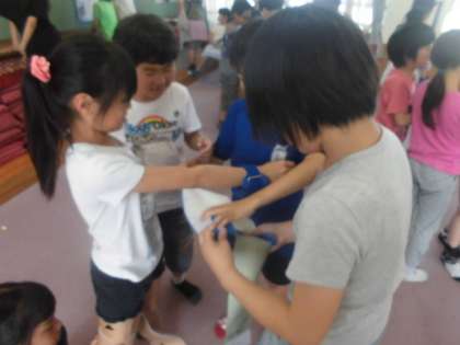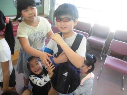 先日,ハナヤ学習で高齢者体験を行いました。特別な装備をして,高齢者の方の体の動きや物の見え方などを体験しました。