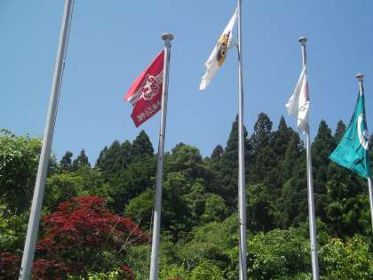 山の家は,雲一つない快晴です。少し汗ばむ陽気ですが,山から吹く風が心地よく,バスの疲れも吹き飛びます。
