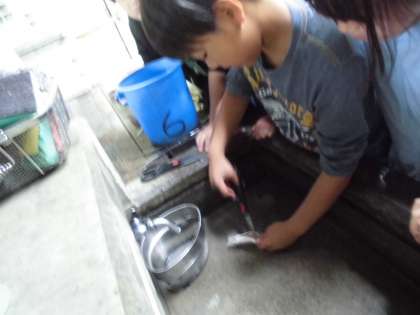始めに「命」についての話を聞き,さっきまで生きていた魚を今から食べる準備をするということで,さっきまで「キャーキャー」いっていた魚の感触が,一気に重みのあるものと変わりました。子どもたちも雰囲気も変わりました。