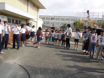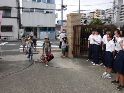 初日は不思議そうにしていた子が多かったものの,元気に中学生にあいさつをしています。