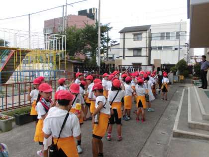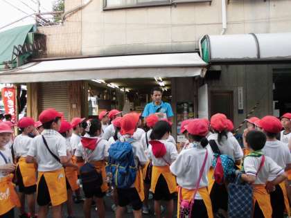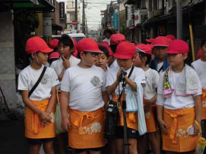 体育館で集合した3年生は,オレンジのエプロンをつけると歩いて商店街へ向かいました。