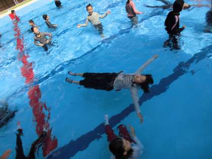 ペットボトルなしで浮く「背浮き」に挑戦です。