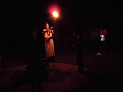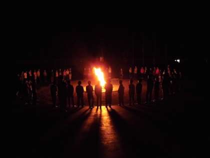 ファイヤー場にそろうと,レクレーション係の進行で,キャンプファイヤーが進められます。