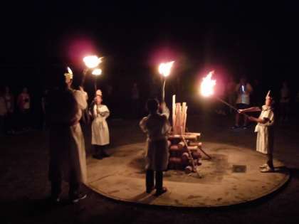「燃えろよ燃えろ」の歌とともに勢いよく燃え上がります。
