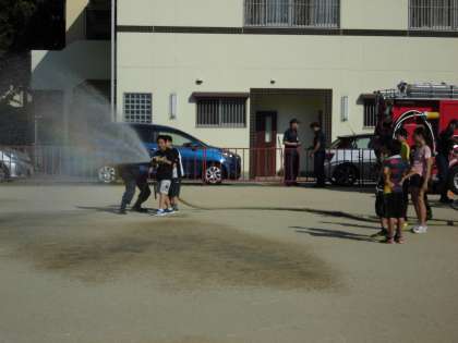 はじめに体育館でお話を聞き,後半は運動場で放水体験です。