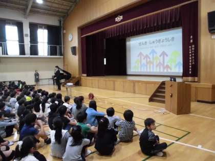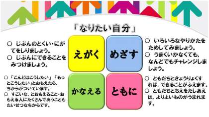 通知票と,学校教育目標をもとに前期をふり返れるよう,「えがく」「めざす」「かなえる」「ともに」の言葉ごとに,どんな視点でふり返ったらいいか,教えてくださいました。