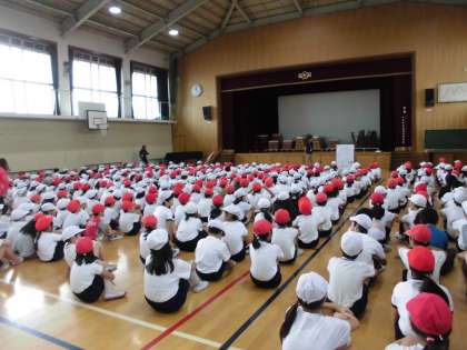 というわけで,急きょ体育館での全校練習にきりかえました。