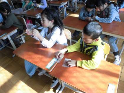 1年生では,食育でお米の学習をしました。実際に籾や稲穂,米を見て,色や形を比べたり,外国の米との違いを見つけたりしました。お米のはたらきや,お米の変身した姿なども学習しました。お米には「体を大きくする」や「勉強する力をつける」などのはたらきがあることを知りました。これからも,しっかりご飯を食べてほしいです。