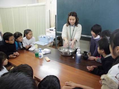「水だけで洗うとき」と「石けんで洗うとき」の違いを,実験しながら示しました。
